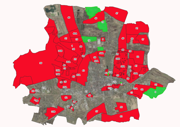 Poniżej znajduje się mapa zasięgów obowiązujących planów wraz z ich numerami. Kolorem czerwonym oznaczone są obowiązujące plany, zaś kolorem zielonym - plany, które są w trakcie opracowania lub zmiany. |